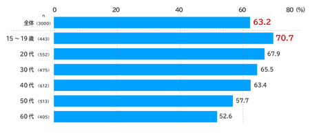 ・AIで得た情報について、ファクトチェックをしている人(「毎回している」「たまにしている」の合計)は63.2%。世代別では、15~19歳が70.7%と最も多い。【図表4】