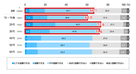 ・ニュースや新しいトピックを知る際にAIの情報を信頼している人(「とても信頼できる」「信頼できる」「やや信頼できる」の合計)は66.1%。世代別では、20代(72.6%)、30代(71.6%)で多い。一方で、15~19歳は60.0%と、全世代の中で最も信頼している人が少ない。【図表2】
