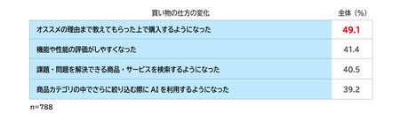 Q. 前問で、AIにオススメされて購入したことがあると回答した方にお伺いします。AIを利用する前と比べて買い物の仕方はどのように変わりましたか。当てはまるものを全てお知らせください。