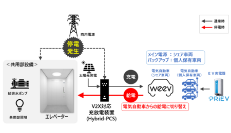 本サービスでは、「weev」のシェアリング車両と「Hybrid-PCS」を接続し、災害時や停電時にはこれらの車両からエレベーターなどのマンション共用部設備への給電を可能とします。また、「PRiEV」を通じて、各入居者のEV保有率向上を図るとともに、シェアリング車両のバックアップとして、入居者が保有するEVからの給電も可能となります。また、デジタライズドアセットであるV2Xシステムおよびエレベーターなどのビル設備から生成されるデータを活用し、Lumada 3.0*2を体現する日立グループのデジタルサービス「HMAX for Buildings : BuilMirai(ビルミライ)」*3を通じて、ビルの省エネなどの新しい価値の提供が可能になります。