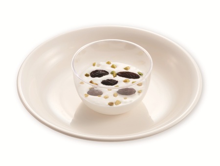 スポンジ生地とミルククリームを重ね、ピスタチオとレーズンをトッピング。伝統的なデザートを再現しました。