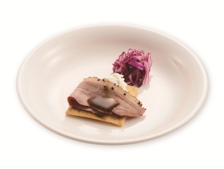 サクサクのクラッカーにマスカルポーネチーズ、燻製した鴨ロースをトッピングし、香り高いトリュフソースを使用。また付け合わせの赤キャベツは酸味をきかせマリネしています。