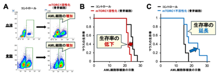 次に、骨芽細胞のmTORC1 シグナルを活性化することによって(=骨芽細胞特異的なmTORC1活性化マウスの作製)、AMLにおける骨芽細胞のmTORC1シグナルの役割を明らかにすることを試みました。その結果、骨芽細胞特異的なmTORC1活性化マウスでは、骨髄中や血中のAML 細胞が著明に増加しており、さらに、AMLの著明な進展が観察されました(図3A, B)。逆に、骨芽細胞のmTORC1 シグナルを不活性化すると(=骨芽細胞特異的なmTORC1不活性化マウスの作製)、AMLが著明に抑制されました(図3C)。これらのことから、骨芽細胞のmTORC1シグナルは、AML細胞の機能とAMLの進展にとても重要であることが明らかになりました。