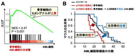 本研究では最初に、病理検体の解析およびバイオインフォマティクス解析により、AML患者およびAMLモデル動物の骨芽細胞において、mTORC1シグナルが活性化していることを見出しました。さらに、細胞特異的遺伝子改変マウスを用いた遺伝学的実験などにより、骨芽細胞のmTORC1-IL6シグナルがAML細胞の機能調節やAML進展に重要な役割を果たしていることを見出しました。以上により、骨芽細胞(=ニッチ細胞)のmTORC1-IL6シグナルがAMLに対する新規創薬標的候補となることを見出しました。