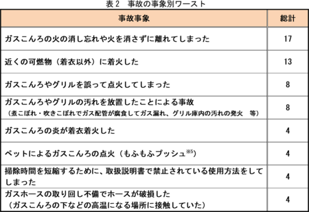 「誤使用・不注意による」事故について、事象別ワーストを表2に示します。火の消し忘れや近くに可燃物があり着火してしまった事故が多くなっています。また、着衣に着火してしまった事故や、ペットによるガスこんろの点火といった事故も発生しています。
