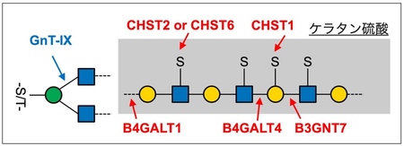 ケラタン硫酸は、B4GALT1、B4GALT4、B3GNT7、CHST1、CHST2、CHST6など複数の酵素によって作られる長い糖鎖です (図3) 。ケラタン硫酸を作るこれらの酵素の働きと、O-Man型糖鎖の根本の枝分かれの有無についてはこれまでわかっていませんでしたが、GnT-IXの欠損によりケラタン硫酸が大きく減少したことから、これらの酵素は直鎖よりも枝分かれした O-Man型糖鎖に働きやすい可能性が考えられました。