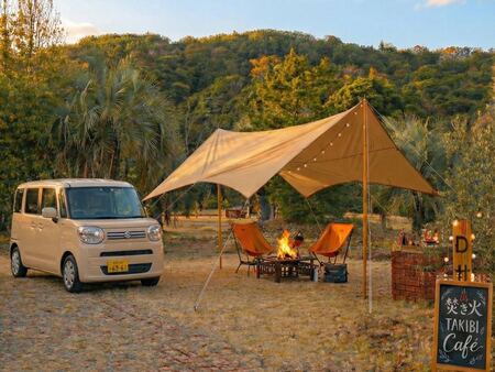 「焚き火カフェ」は、アウトドア用品を持たずとも、区画ごとのプライベート空間で焚き火を囲みながら飲食や滞在を楽しめる体験型サービスです。各区画には車を横付けすることができ、初心者の方でも気軽にアウトドア体験が可能です。