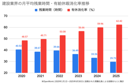 ・「建設業界の月平均残業時間・有給休暇消化率推移」および「建設業界におけるスコア推移」: OpenWorkに2020年1月1日〜2025年9月30日に投稿された現職社員による投稿をもとに集計。集計対象とした投稿数は、建設業界が7,726件、全業界は331,786件。