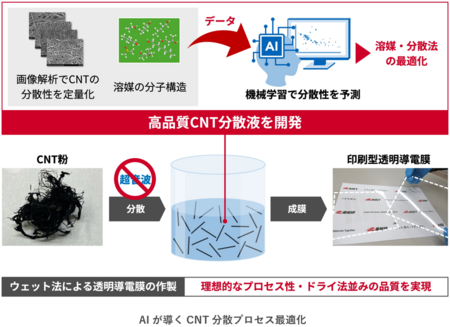 ・ 機械学習を活用して、液中のCNTの分散に最適な溶媒を選定し、超音波処理に頼らない高品質CNT分散液を得る手法を開発