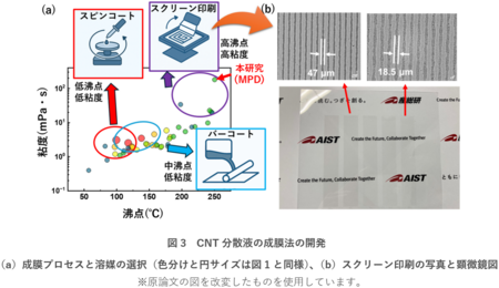 ウェット法の最大の利点は、印刷を含む多様な成膜プロセスに適用できる点です。本研究では、図3(a)に示すように、図1で構築した分散マップを基に解繊度が0.8以上を示す溶媒の沸点と粘度を整理しました。これにより、多様な成膜技術に適用できるCNT分散液の設計が可能となり、用途の拡大につながります。例えば、スピンコートでは、急速な乾燥と均一な膜形成を実現するため、約100 ℃付近の沸点で低粘度の溶媒が適しています。バーコートでは、大面積塗布の安定性を保つために、100〜150 ℃程度のやや高い沸点と低粘度が望まれます。一方、スクリーン印刷やブレードコートでは、インクの安定性とパターンの精度を保つため、より高い沸点と高い粘度の溶媒が必要となります。このように、解繊度の高い溶媒についてその沸点や粘度を可視化することで、分散性を維持しつつ、成膜プロセスに応じた最適な溶媒を選択することが容易になりました。例えば、高解像度のスクリーン印刷を行うために、本研究では3-メチル-1,5-ペンタンジオール(MPD)を溶媒として選択しました。この溶媒は、高い粘度(20 ℃で181 mPa·s)と約250 ℃という高い沸点を有しており、スクリーン印刷に適した特性を備えています。その結果、図3(b)に示すように、18.5 µmという極細CNTラインのスクリーン印刷に成功し、世界最高性能の印刷型CNT透明導電膜を実現しました。