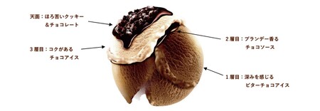 本商品は、深みを感じるビターチョコアイスと、コクがあるチョコアイスで、ブランデー香る※1チョコソースを挟み込み、天面には食べ応えのあるクッキーとチョコレートを敷き詰めました。ビターチョコアイスは、苦みを強調することでさらに大人向けの味わいにブラッシュアップしました。