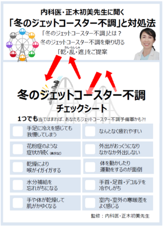 このように急変する気候の影響を受ける冬の不調のことを、当社では「冬のジェットコースター不調」と命名し、内科医・正木初美先生監修の下、「冬のジェットコースター不調 チェックシート」を作成しました。このチェックシートは全10問からなり、今の自分の状況で当てはまるものをチェックしてください。1つでも当てはまるものがあれば、あなたは「冬のジェットコースター不調」の予備軍です。