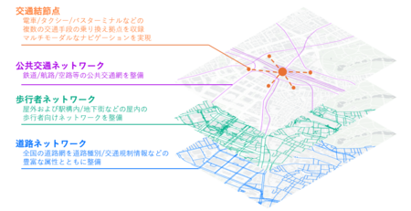 「Mobility based Network」は、そんな「時空間データベース」からの自動生成が可能な、業界屈指の網羅性と精度を誇るネットワークデータです。自動車道路から公共交通(電車・バス・フェリー)、さらに駅構内や地下街などの歩行者専用通路まで、移動にかかわる日本全国のあらゆる通路と、それらを接続する交通結節点の情報を組み合わせて管理しています。様々な次世代モビリティを支えるデータ基盤として新たな価値を提供します。