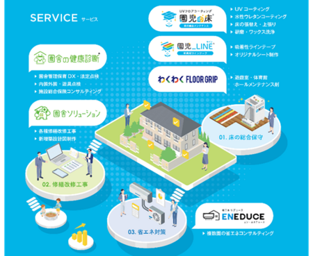 エコテックの注力事業として、全国の保育園・幼稚園・認定こども園が抱える「園舎の老朽化」「安全リスク」「管理の属人化」「情報の分散」「修繕の優先順位が分からない」といった課題に対し、床保全を起点に、点検・修繕・省エネ対策、DXによる情報一元化までを一貫して支援する取り組みを行っています。