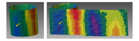 円筒面の凹凸データをヒートマップとして2D展開することで、パイプ形状のような曲面でも、凹凸検査結果を一目で把握できるようになりました。従来は円筒外周を部分ごとに確認していた作業を、一度の表示で全体を俯瞰できるため、異常箇所の発見が容易になり、検査時間を大幅に短縮します。