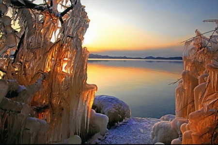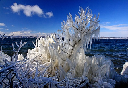 これは湖水が冬の強風にあおられて、岸辺の樹木に氷着したもので国内ではきわめて珍しい現象だといわれています。