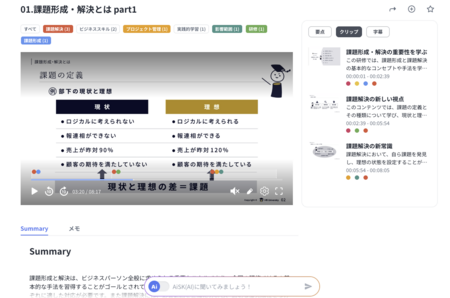 機能:学習コンテンツ (見放題1,000本以上およびオプションコンテンツ)、AI コンテンツ分析、AI 学習プラン作成、AI 検索、モバイルアプリ、ダッシュボード、タスクの割り当て、AI テスト & 認定証発行、学習メモ、自社コンテンツアップロード (ライトプラン以上の契約必要)