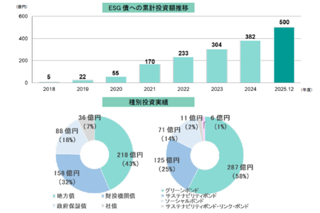 JARCは、2000年に設立されて以来、資源の有効利用及び環境保全に寄与すべく、自動車のリサイクル及び適正処理の促進に関する事業等を実施しています。2018年からは、更に持続可能な社会の実現に貢献するために、自動車ユーザーから預託されたリサイクル料金の管理運用を実施する事業においてESG投資を開始しました。*3 2025年12月末時点で、ESG債の累計投資額は500億円となっています。