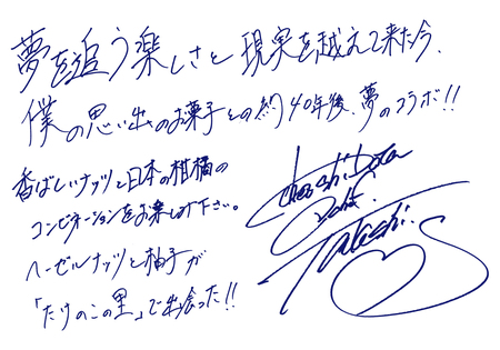 柴田シェフと「たけのこの里」の出会いから約 40 年、時を超えて実現したコラボレーションとして、香ばしいナッツと柚子のコンビネーションを楽しめる味わいに仕立てていただきました。チョコレート部分は 2 層構造で、「たけのこの里」ならではのカカオ香るチョコレートと、ヘーゼルプラリネに柚子を合わせたチョコレートを使用しています。チョコレートとクッキー部分にはロレーヌ岩塩も配合し、クセになる味わいです。 ※2 香ばしいナッツと柚子のコンビネーションをお楽しみください。