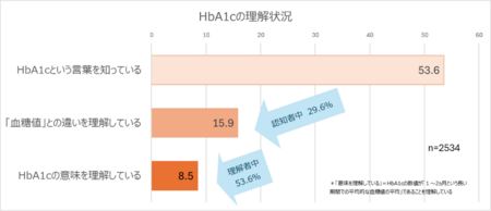 その中でも「HbA1cが直近1~2か月という長い期間での平均的な血糖値の推移を示す指標である」ことを 正しく回答できた人は、53.6%でした。全体の割合では、HbA1cについて正しく理解している人は、8.5%と1割未満にとどまるという結果になりました。