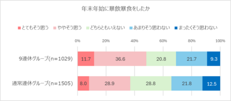 年末年始の「暴飲暴食」(食べ過ぎ、飲み過ぎ)については、9連休以上グループでは48.3%が「したと思う」と回答したのに対し、通常連休グループは36.9%と、11pt以上の開きがありました。