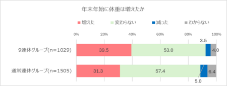 年末年始の体重について、9連休以上グループでは39.5%が「増えた」と回答。通常連休グループでは31.3%と、約8ptの差がありました。