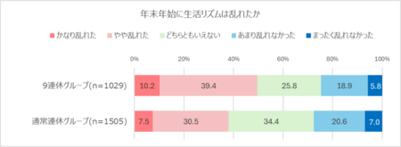 【6】年末年始の生活リズム:9連休以上グループは49.6%が「乱れた」と回答。通常連休グループと約12ptの差