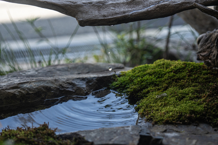 腕木の先から水滴がぽたぽたと落ち、水が跳ね苔に潤いや艶感を感じさせる様子