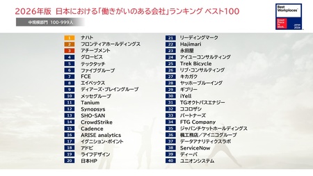・GPTW Japanは、2026年版調査(調査期間:2024年7月~2025年9月)にエントリーした683社にアンケート調査を行い、調査結果が一定水準を超えた「働きがい認定企業」の中から特に働きがいの水準が高い上位100社を「『働きがいのある会社』ランキング ベスト100」として選出した。