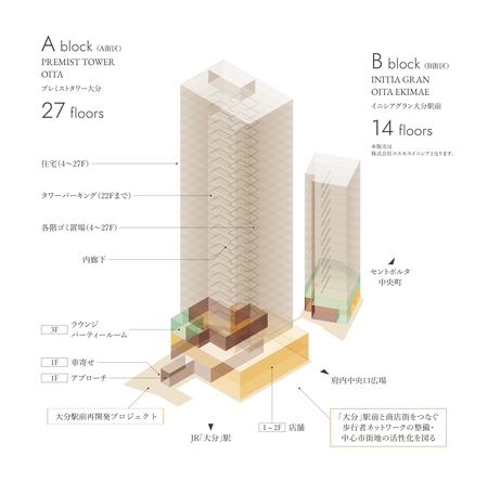 「大分駅前再開発プロジェクト」は、土地の合理的かつ健全な高度利用と都市機能の更新を図るとともに、活力ある経済活動の基盤となる市街地の再生・再構築および防災性の向上を促進するため、飲食店や店舗、事務所が入居する小規模の雑居ビルが立ち並んでいた区画を複合施設に再開発するものです。再開発地は、本マンションや商業施設で構成するA街区(駅側)と、大和ハウスグループのコスモスイニシアが開発する分譲マンションや商業施設で構成するB街区(産業通り側)に分かれています。2021年3月に地権者で構成される再開発組合が設立され、2023年6月に既存建物の解体工事、2024年4月に着工しました。