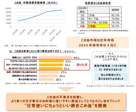 ビタミンEを豊富に含み、コクと甘さが特長のこめ油。健康感やおいしさが支持されている一方で、風味や独特のにおいが好みではない、といった声も聞かれます。そこで、昭和産業ではこめ油の良さを活かしつつ、不満点を解消する商品として『とうもろこし&こめ油 軽やかブレンド』を開発しました。