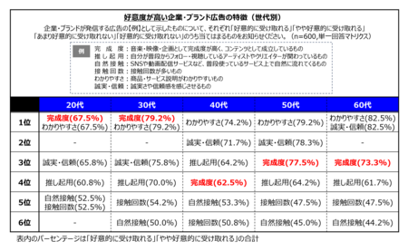 普段よく見る・利用するメディアについて、50代・60代では依然としてテレビが最も利用されているものの、その他の世代ではYouTubeが最も見られており、20代・30代ほどソーシャルメディアの利用率が高い結果となりました(グラフ3)。また、企業・ブランドが発信する広告の中で好意的に受け取られているものについて世代別に調査したところ、20・30代では、全年代で1位の「わかりやすさ」に並び「完成度」もトップとなりました(表1)。これらの結果から、20代・30代向けの広告コミュニケーションでは、音楽・映像として完成度の高いコンテンツを、テレビ以外のメディアでも発信することの必要性があると考えられます。