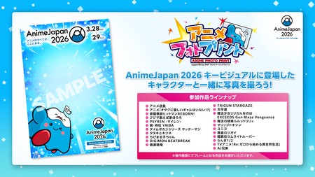 キービジュアルに登場したキャラクターと写真が撮れる【アニメフォトプリントsupported by DNPフォトイメージングジャパン】の実施が決定しました。AnimeJapan限定フレームで撮影できるのは、AnimeJapan当日の2日間だけ!来場した記念にぜひお楽しみください!