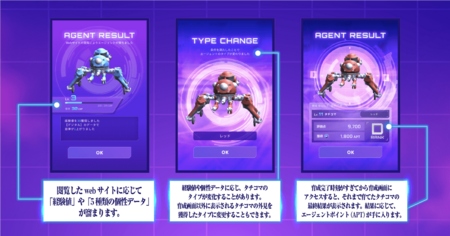 閲覧するWebサイトに応じて「経験値」や「5種類の個性データ」が溜まり、その個性によってタチコマのタイプが変化します(図3参照)。育成が完了すると、その結果に応じてエージェントポイントが溜まります。