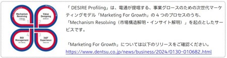 株式会社電通(本社:東京都港区、代表取締役 社長執行役員:佐野 傑)と株式会社電通マクロミルインサイト(本社:東京都中央区、代表取締役社長:眞鍋 尚行)との消費者研究プロジェクトチーム「DENTSU DESIRE DESIGN(デンツウ・デザイア・デザイン)※1」(以下、DDD)は、商品やブランドの需要の源泉となる消費者が潜在的に持っている「ほしい・したい」気持ちを独自のノウハウで指標化した「11の欲望※2」を活用した顧客分析パッケージ・ソリューション「DESIRE Profiling(デザイア・プロファイリング)」の提供を本日より開始します。企業が自社メディアやECサイトなどを通じて取得した顧客の行動履歴であるファーストパーティデータと「11の欲望」を連携し、心理と行動の両面から精度の高い顧客分析を実現し、効果的なマーケティング施策の実施などを支援します。