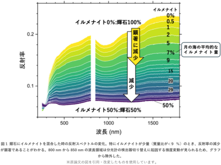 ・ 最大25段階の比率で混合したイルメナイト(FeTiO3、チタン鉄鉱)と輝石の混合粉体で月面を再現し、反射スペクトルデータを取得