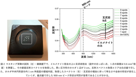 また、輝石(または玄武岩)100 %の状態からイルメナイト含有量を増加させていく量的な「混合実験」と平行して、イルメナイト100 %の状態から輝石(または玄武岩)が占める表面積を増加させていく面的な「マスキング実験」という独自の新規アプローチも採用しました(図2)。混合実験では月の海の玄武岩の典型的な組成を想定して、イルメナイト含有量の大小によってハイパースペクトルがどのようなバリエーションを示すのか明らかにすることを目指しました。一方、マスキング実験では視点を変えて、月面のイルメナイトリッチな領域に玄武岩的な物質が降り積もった場合に起こり得るスペクトル変化を調べました。低重力環境で大気を持たない月面では、もともと表面の岩石に含まれていた輝石が隕石衝突などを受けて飛ばされ、一部が近くのイルメナイトリッチな領域上に降り積もるようなことが起こり得ます。このマスキング実験の結果、イルメナイト反射スペクトルに特徴的な900-nmピーク形状は輝石や玄武岩の影響を受けず、イルメナイトの判別に有用であることが分かりました。