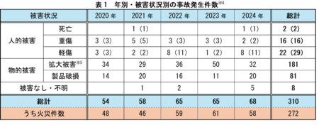 (※4)()は被害者数。物的被害(製品破損または拡大被害)があった場合でも人的被害のあったものは、人的被害に区分している。また、人的被害(死亡・重傷・軽傷)が複数同時に発生している場合は、最も重篤な分類で事故件数をカウントし、重複カウントはしていない。