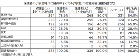 また、学校の宿題の内容について、自身の小学1~3年生、小学4~6年生の頃と、現在の子どもの状況をそれぞれ尋ねたところ、現在の子ども、保護者の小学1~3年生、小学4~6年生の頃いずれも計算ドリル、漢字の書き取り、教科書の音読などを中心とした宿題が出されており、保護者の時代と現在の子どもの間に差は見られませんでした。