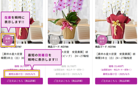 本システムでは、市町村まで特定できるお届け先様の郵便番号に加え、ご注文時点の現在時刻、商品ごとに異なる出荷元の所在地、各出荷元の営業時間・締切時間などの条件を自動で読み込み、注文リミットを判定しています。そのため、一般的な「目安表示」ではなく、事前にお電話でお問い合わせいただくのと同等レベルの、正確な在庫状況およびお届け可能日時を画面上で確認することが可能です。