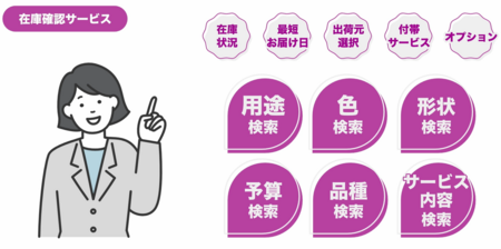 ※2026年1月時点、自社調べ。複数条件によりタイムリーに更新される在庫やお届け日を検索できるサービスとして。