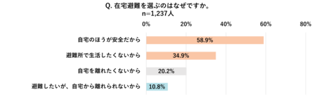 なぜ、多くの人が在宅避難を選ぶのでしょうか。その理由の第1位は「自宅の方が安全だから(58.9%)」でしたが、第2位には「避難所で生活したくないから(34.9%)」が続き、避難所生活の環境に対する強い懸念や拒否感がうかがえます。