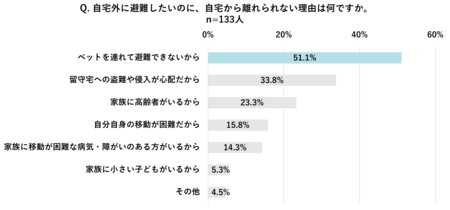 また、避難したくても「自宅から離れられない」切実な理由も存在します。その筆頭がペットの存在です。「ペットを連れて避難できないから」という回答が51.1%でトップとなり、ペットと共に暮らす世帯にとって、在宅避難は選択肢の一つではなく、避けて通れない課題となっていることが明らかになりました。