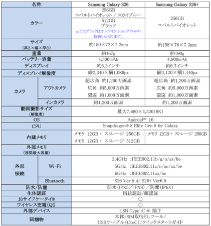 <主な仕様:「Samsung Galaxy S26」、「Samsung Galaxy S26+」>