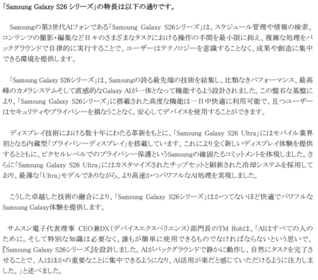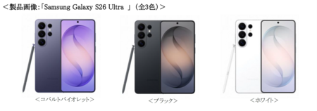 サムスン電子ジャパン株式会社(以下、サムスン)は本日、パワフルなハードウェアと業界をリードするカメラ性能、進化した直感的なGalaxy AI※が日常をかつてないほど快適で簡単にしてくれる先回りするAIフォン「Samsung Galaxy S26」、「Samsung Galaxy S26+」、「Samsung Galaxy S26 Ultra 」(以下、「Samsung Galaxy S26シリーズ」)を株式会社NTTドコモ(以下、ドコモ)で発売を決定いたしましたのでお知らせいたします。「Samsung Galaxy S26シリーズ」は全国のドコモショップ、ドコモ取扱店、ドコモオンラインショップ、ahamoサイトにて2026年2月26日(木)より予約受付を開始し、2026年3月12日(木)より販売開始予定です。