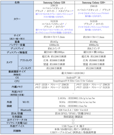 <主な仕様:「Samsung Galaxy S26」、「Samsung Galaxy S26+」>
