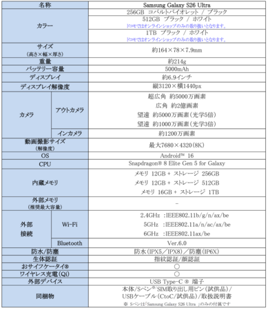 <主な仕様:「Samsung Galaxy S26 Ultra」>