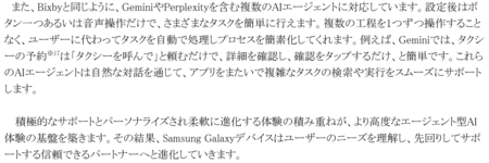 ※16 Bixbyの使用にはSamsungアカウントへのログインとネットワーク接続が必要です。利用可能な機能は国や地域、言語によって異なる場合があります。Bixbyが音声認識できるのは、英語(イギリス)、英語(米国)、英語(インド)、フランス語(フランス)、ドイツ語(ドイツ)、イタリア語(イタリア)、日本語(日本)、韓国語(韓国)、中国語(中国本土)、ポルトガル語(ブラジル)、スペイン語(スペイン)、スペイン語(ラテンアメリカ)の特定のアクセントと方言のみです。今後、その他の言語にも対応予定です。すべてのアクセント、方言、表現が認識されるわけではなく、実際のパフォーマンスは発音や音量、周囲の環境によって異なる場合があります。メディア(動画/ゲーム/音声)の記録中、通話中、最大電力節約モード、緊急モード、Samsung Kidsなど、特定の条件下ではBixbyの機能をご利用いただけない場合があります。サービスの利用可否は国または地域、キャリア、言語、デバイスモデル、OSバージョンによって異なる場合があります。Bixbyの操作対象は一部のアプリですが、今後その他のアプリにも対応を拡大する予定です。SmartThingsを有効化したデバイスをBixbyで操作するには、最初にデバイスを「SmartThings」アプリに接続する必要があります。詳しくは、SmartThingsのウェブサイト(www.samsung.com/smartthings)をご覧ください。