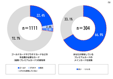 ・カードタイプの保有率について、プレミアムカード(「ゴールド」「プラチナ」「両方」の合計)は27.3%。左図で「プレミアムカード」を選択した人のうち、「プレミアムカードが一番使うカード」と回答した人は66.9%。【図表1】
