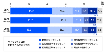 ・キャッシュレス決済利用者(キャッシュレスが利用できるところでは「100%キャッシュレス」から「20%程度がキャッシュレス」の合計)は94.5%で着実な浸透がうかがえた。使える場所では「100%キャッシュレス」を利用する人は45.2%で、2023年調査(40.3%)以降、上昇傾向が見られる。【図表3】